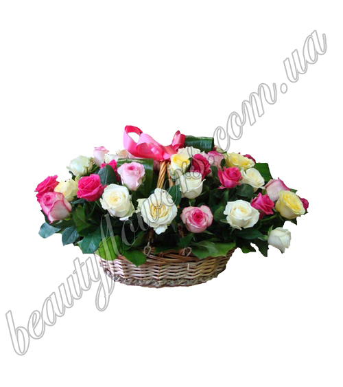 Состав корзины цветов: Состав корзины цветов: разноцветные розы (35 шт.), корзина.