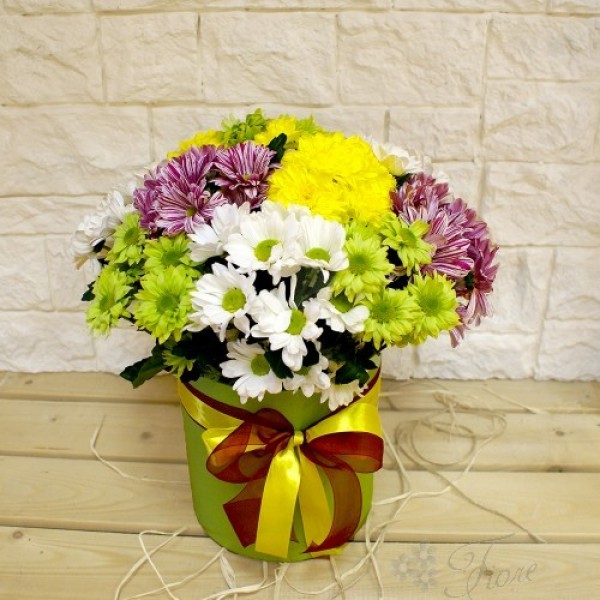 Яркая композиция из разноцветных хризантем будет по нраву любой представительницы прекрасного пола, и не важно сколько ей лет, хоть это малая девочка, милая девушка или же пожилая женщина. Цветы стоят на подпитке (оазисе), что увеличивают их продолжительность свежести на долго время, и тем самым будут радовать получателя, при правильном уходе, своей красотой до 10 дней.