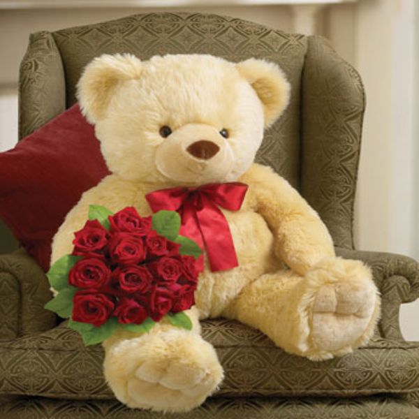 В стандартной комплектации представлен Мишка-Гигант 100 см и 15 красных роз упакованных в праздничную упаковку. Если нужен мишка большего размера, напишите нам и мы постараемся для Вас его найти. Также количество роз может быть увеличено до бесконечности:-)))